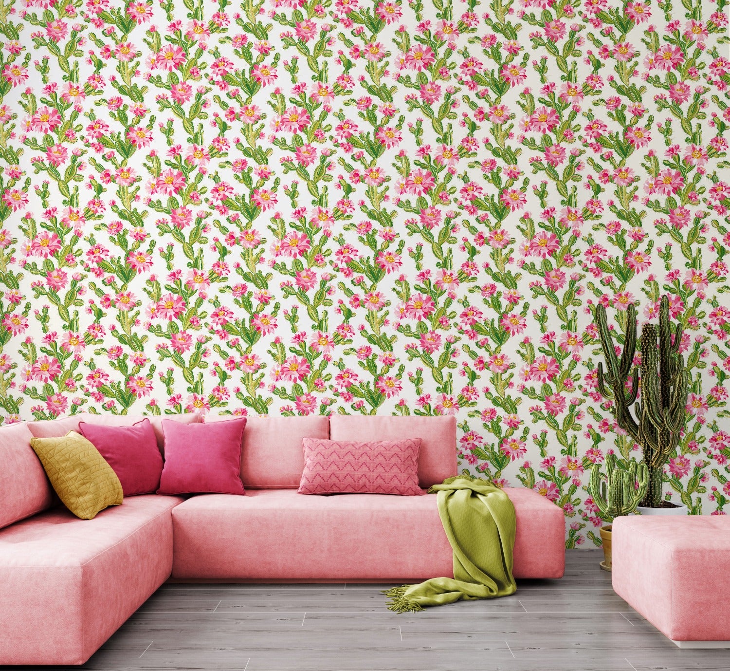 Cactus Bloom balances natural forms with a contemporary aesthetic, using vibrant hues and expressive brushstrokes that evoke the warmth of a desert sunset. Each cactus is accented with a vibrant watercolour bloom, that creates the ultimate contrast against the design’s clean backdrop. It's the perfect way to infuse your space with natural charm and a fresh, modern botanical.