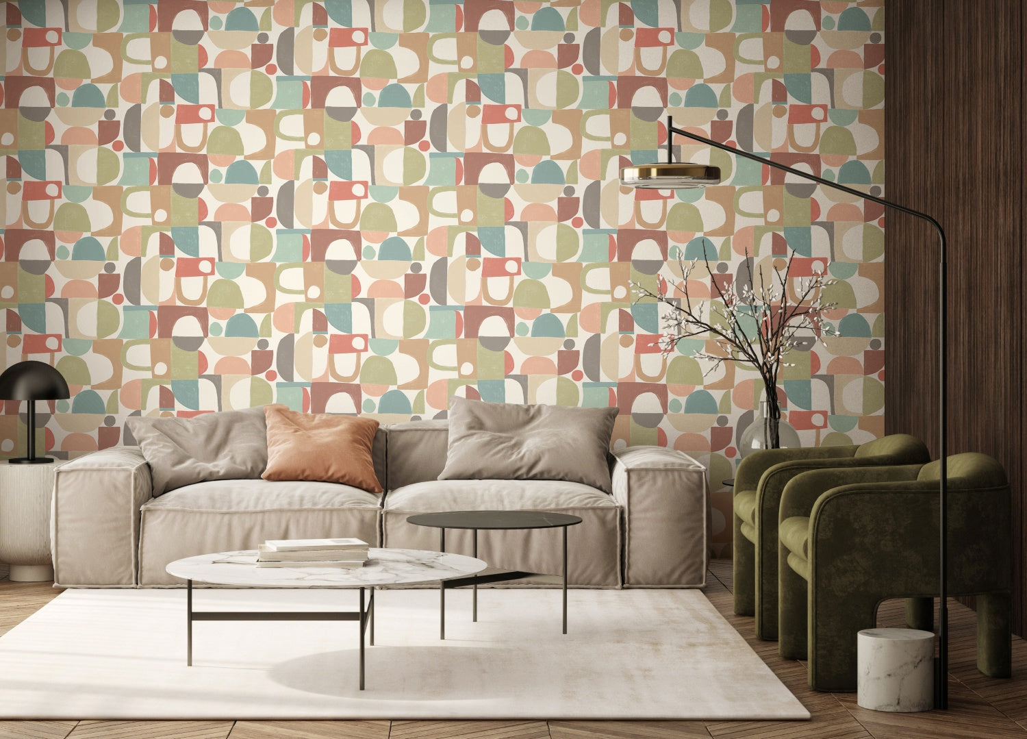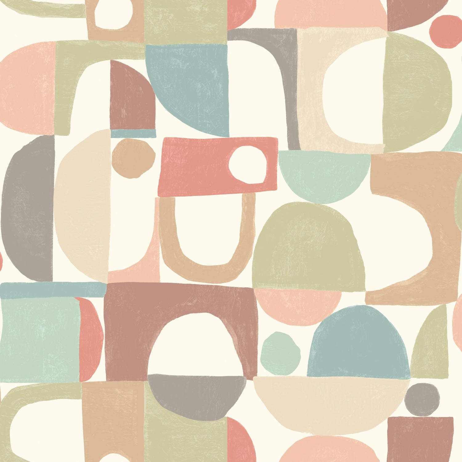 Inspired by modernist block printing and painterly texture, the Configure design celebrates the intentional arrangement of form and colour. This wallpaper features soft, hand-drawn geometries, from open arches to solid discs, that seamlessly interlock to define your walls.