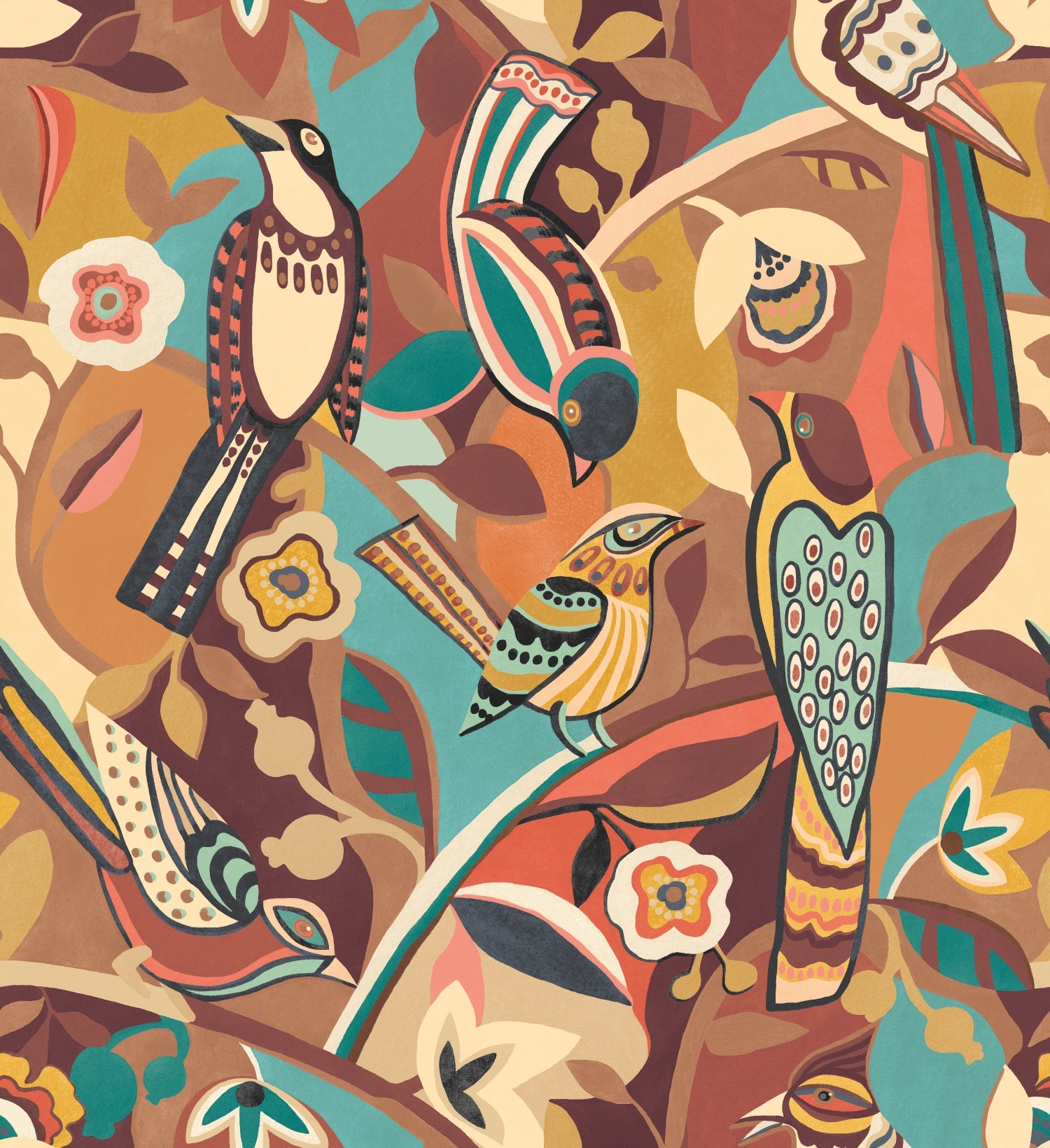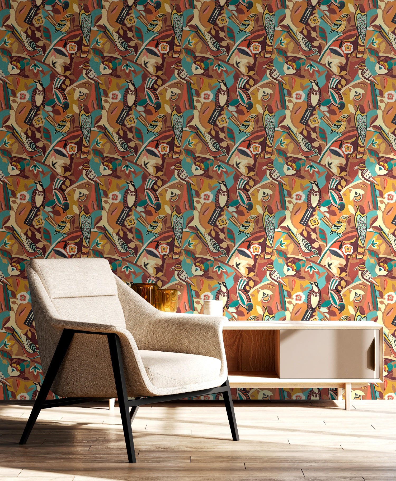 An expressive wallcovering featuring stylised birds, graphic florals, and bold colour blocking. This design merges traditional folk motifs with contemporary energy, creating an unforgettable statement piece. Perfect for adding depth and charm to any space.
