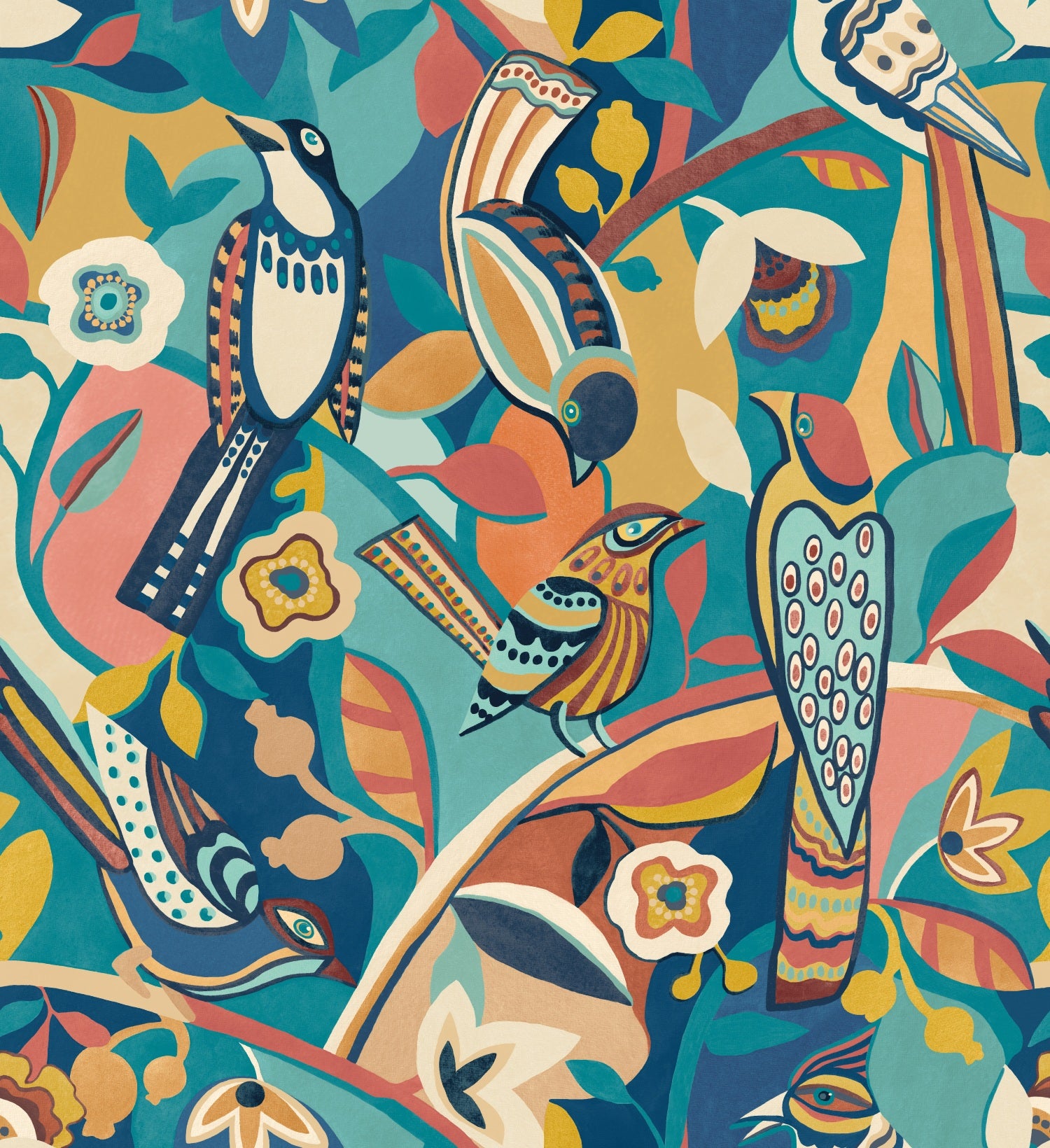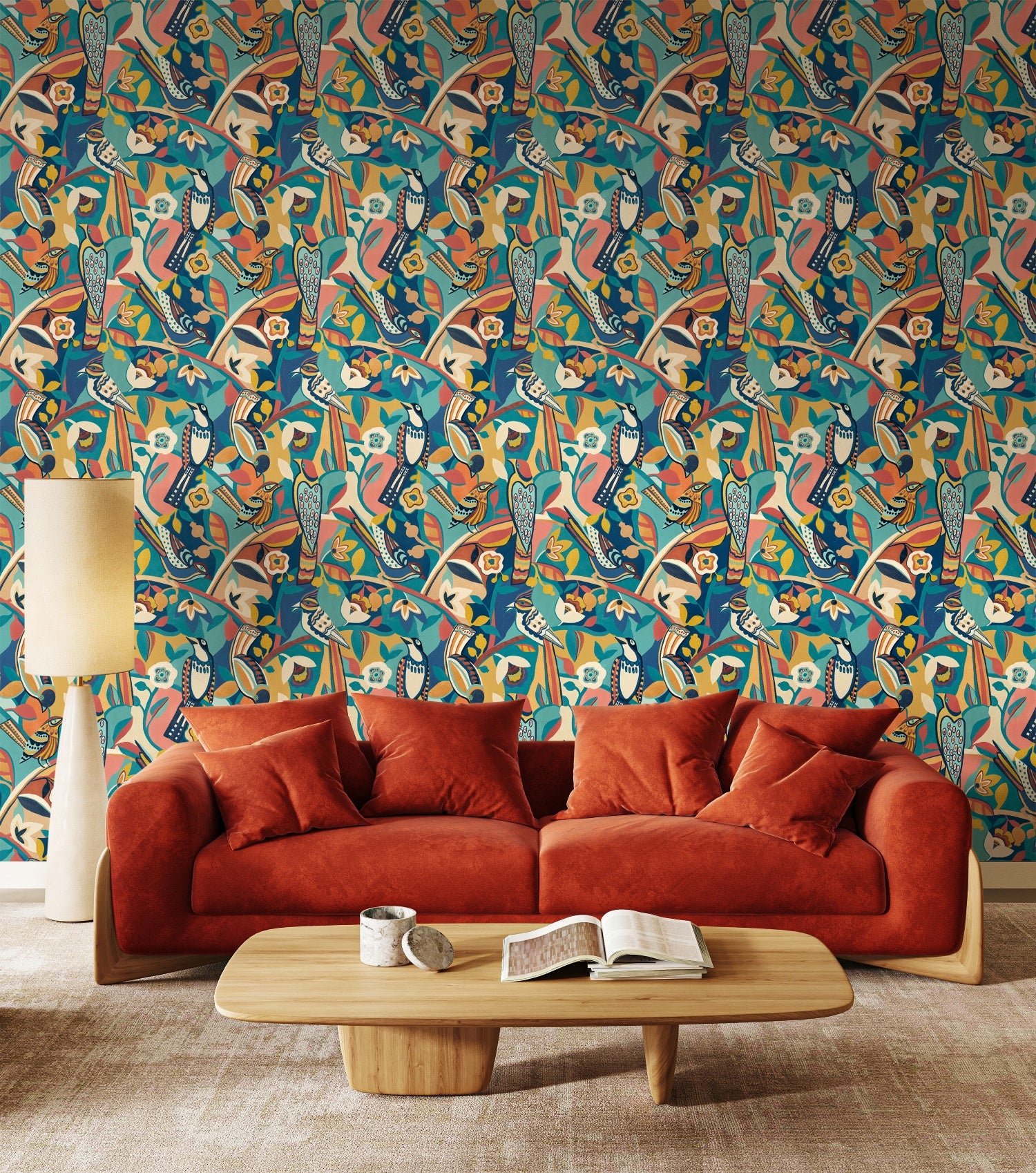 An expressive wallcovering featuring stylised birds, graphic florals, and bold colour blocking. This design merges traditional folk motifs with contemporary energy, creating an unforgettable statement piece. Perfect for adding depth and charm to any space.