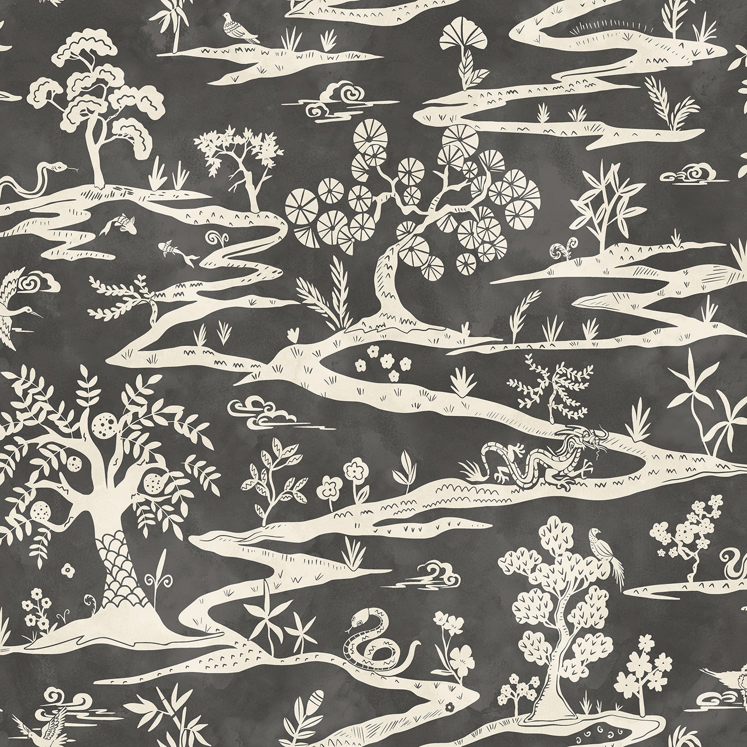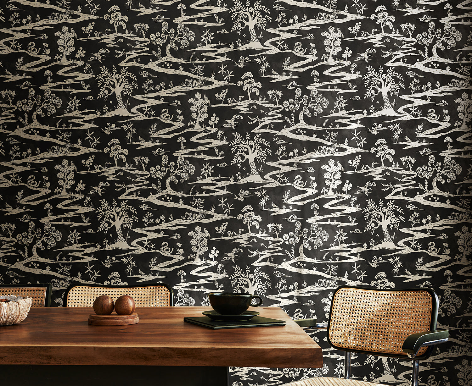 Rendered in just two contrasting tones, Kaiwa has a modern, graphic feel while nodding to the rich visual language of traditional Japanese art. Organic and layered, a conversational landscape unfolds slowly, like walking an enchanting woodland path. "Kaiwa", meaning "conversation" in Japanese, reflects the storytelling nature of the design, ideal for interiors that embrace creativity and meaning.