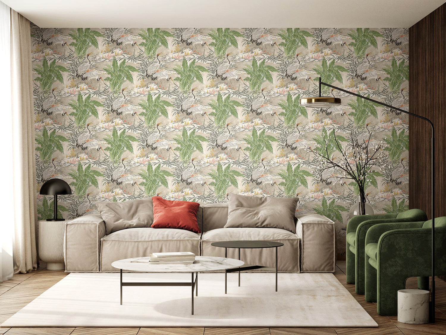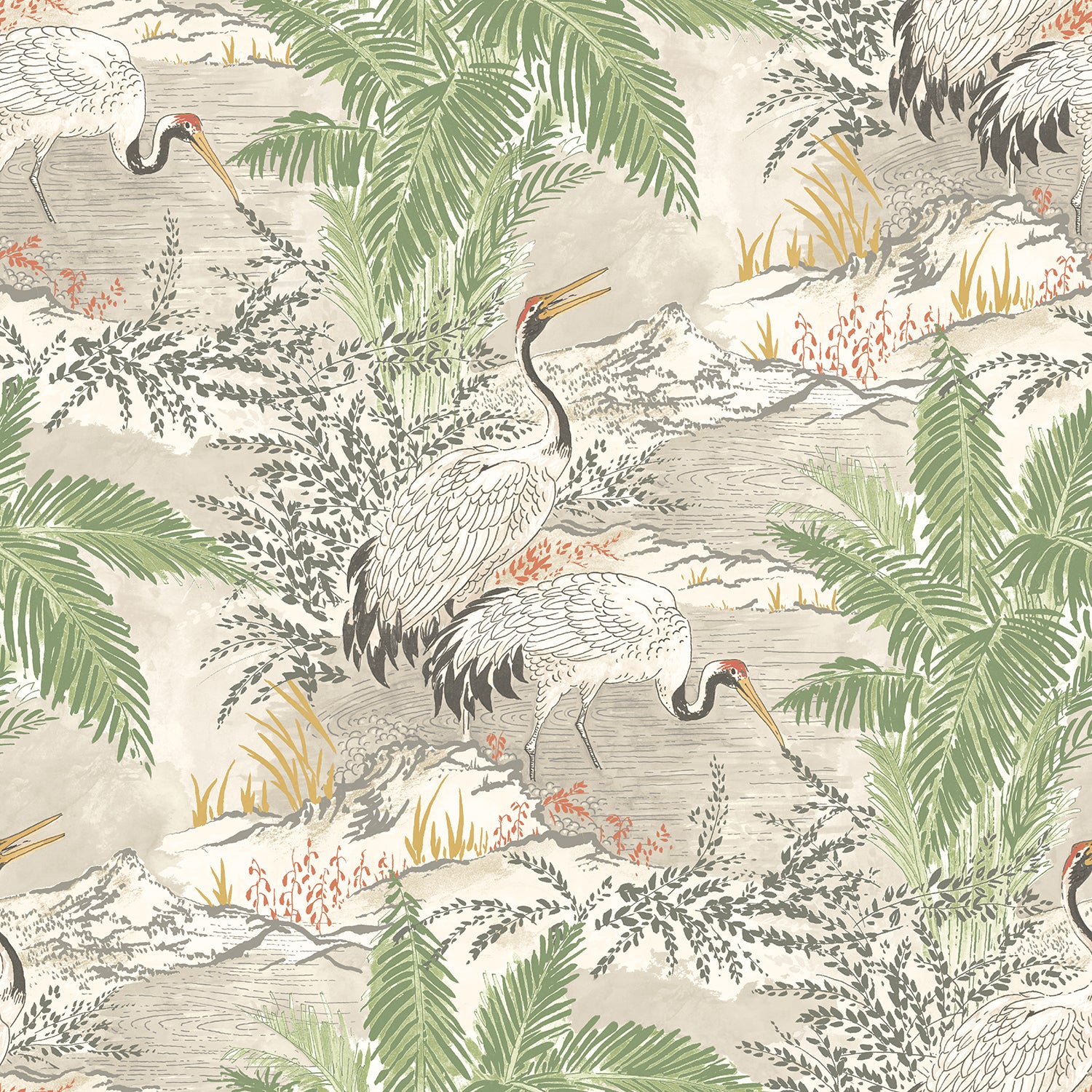 Graceful and poised, cranes step elegantly through rippling shallow waters and nestle among a tapestry of leaves and foliage. A timeless symbol of peace and longevity, their poised forms and textured feathers capture both movement and stillness, whilst the cranes appear in quiet dialogue with nature, creating a reflective and balanced space.