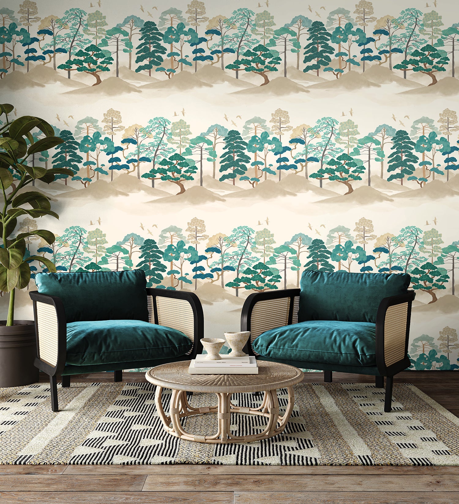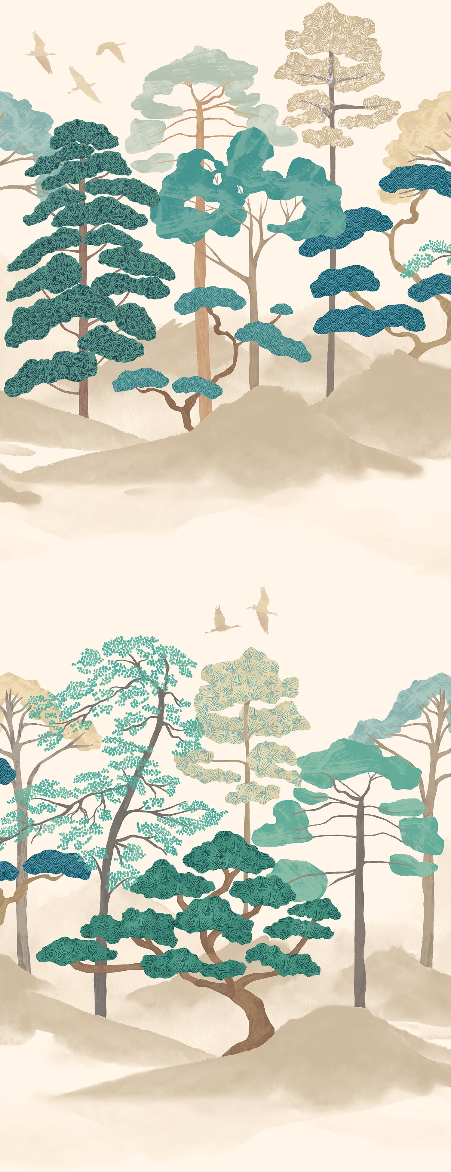 Capturing the beauty of traditional Japanese landscapes, this design features stylised blossom, pine and bonsai trees, or kigi, that repeat elegantly across the wall. Painted in soft watercolours, this design beautifully depicts gently rising hills and birds in flight over a serene landscape. The horizontal formation of the trees brings a contemporary sense of structure to the otherwise organic forms, inviting nature indoors and creating a timeless and grounded feel.