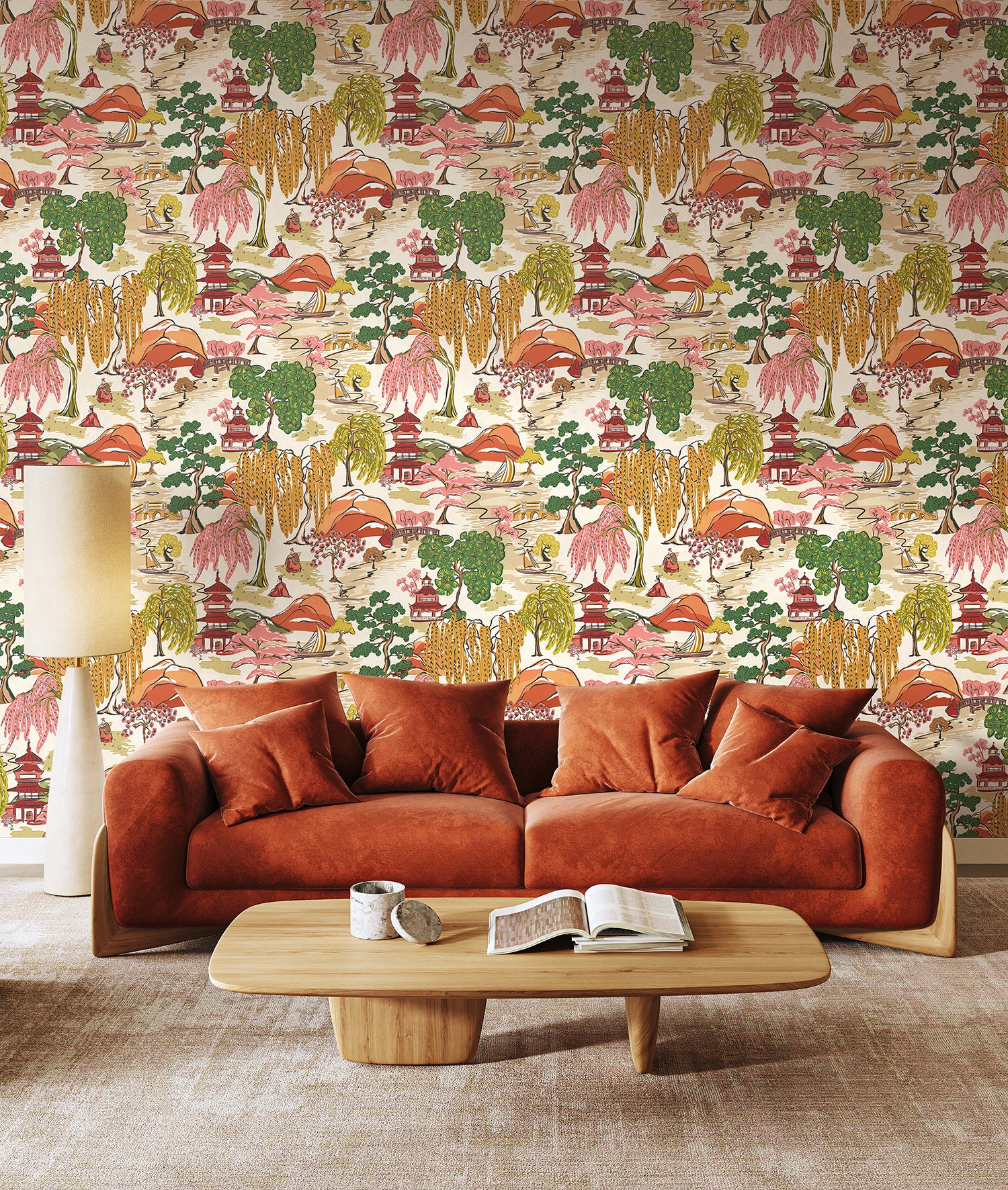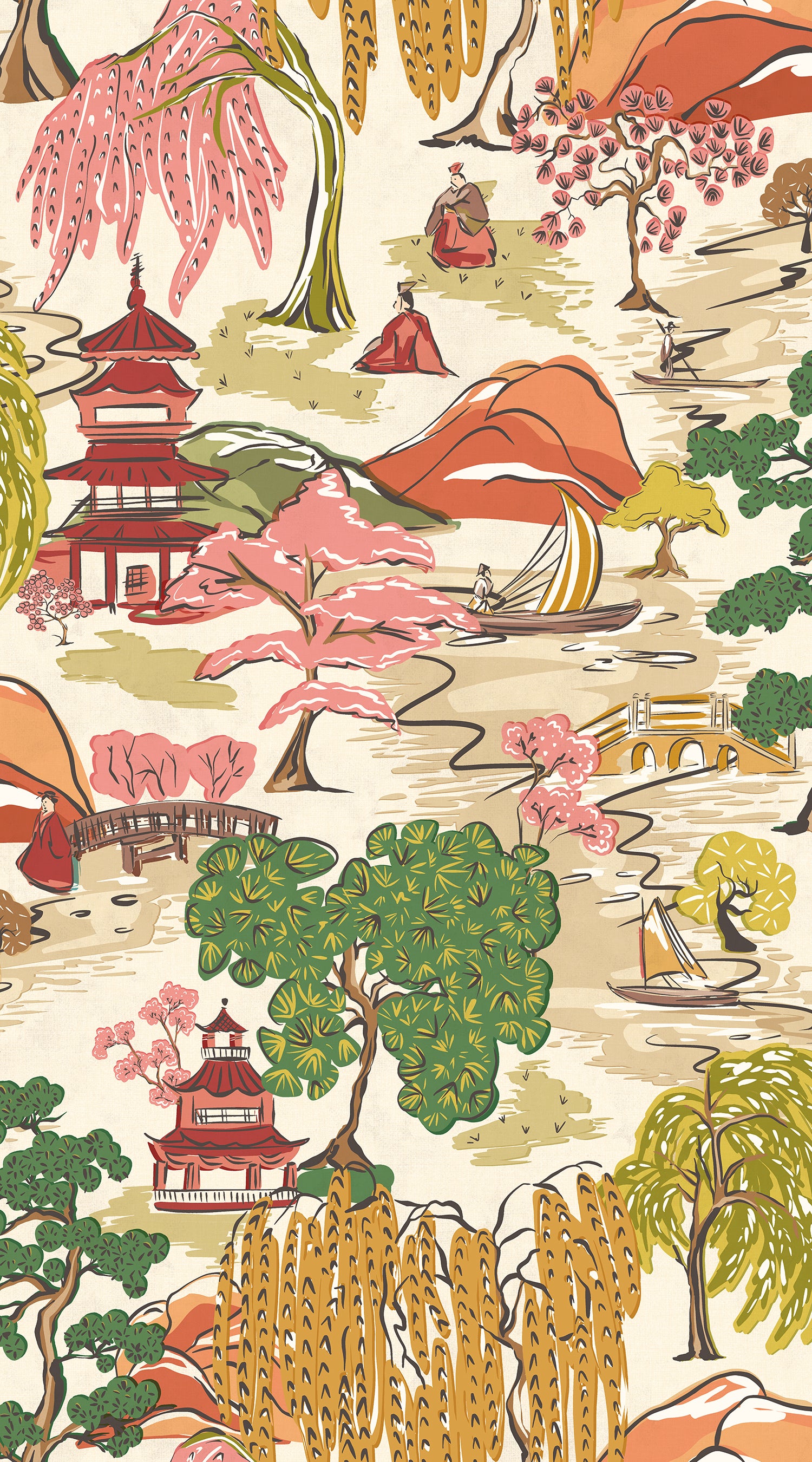 Inspired by traditional Japanese landscapes, Oka captures a richly detailed and illustrative scene, where rolling hills are dotted with willow trees, boats and traditional figures. Pagodas sit at the heart of the design, nodding to the beauty of Japanese architecture, symbolising sacred space and quiet contemplation, ideal for interiors that seek character and calm. Designed with an overprint effect which mimics traditional hand printing, this effect adds depth and a sense of movement.